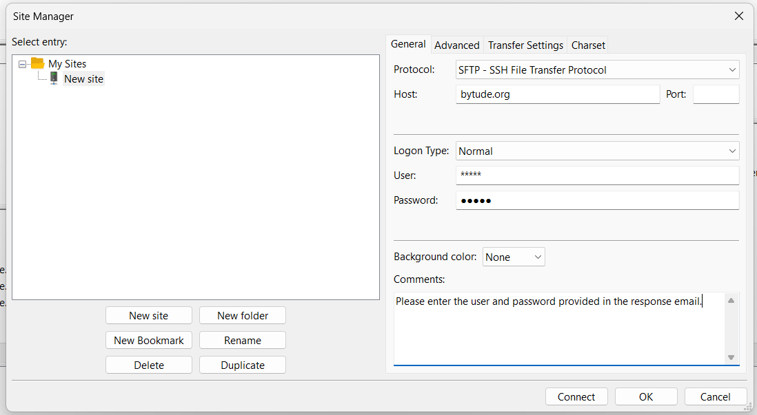 To connect to the server: At the top, click "File" > "Site Manager..." (or Ctrl+S). Click "New site" then Enter the info and click "Connect":